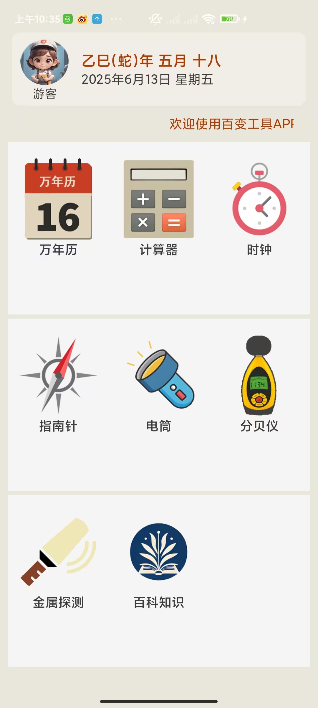 百变工具是一款免费的常用工具软件,软件包含万年历、计算器、时钟、指南针、电筒和分贝仪等功能。